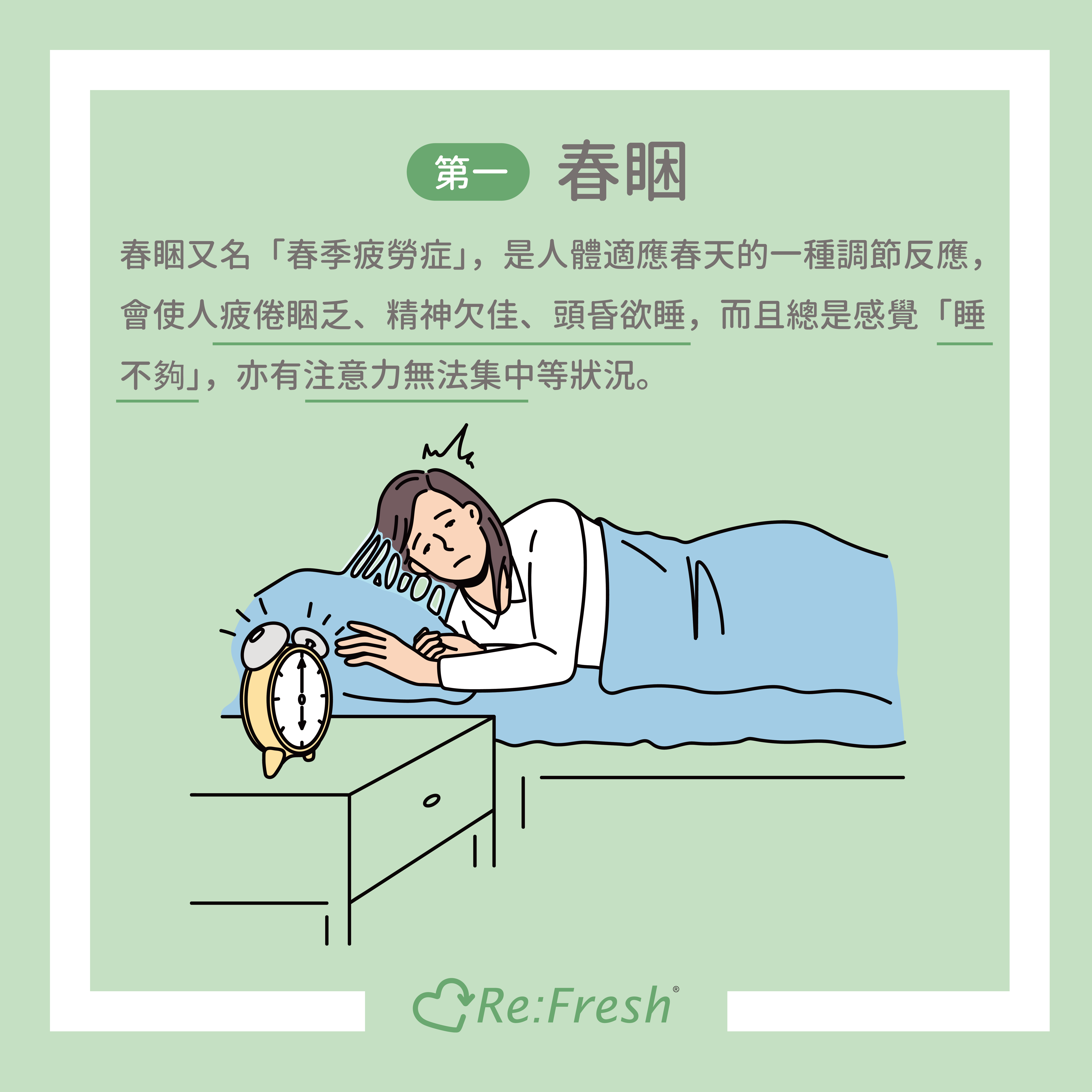 春睏又名「春季疲勞症」,是人體適應春天的一種調節反應,會使人疲倦睏乏、精神欠佳、頭昏欲睡,而且總是感覺「睡不夠」,亦有注意力無法集中等狀況。