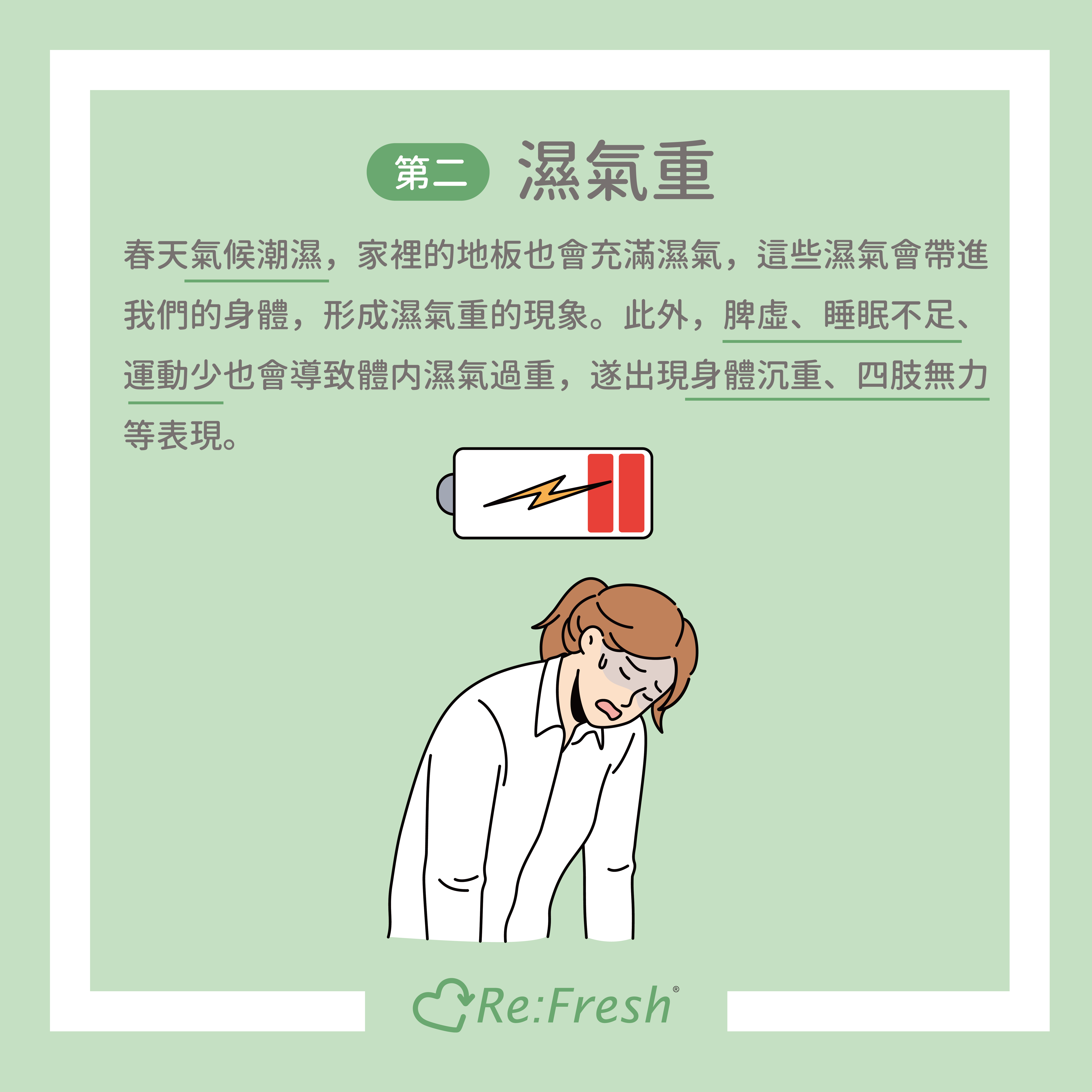 春天氣候潮濕,家裡的地板也會充滿濕氣,這些濕氣會帶進我們的身體,形成濕氣重的現象。此外,脾虛、睡眠不足、運動少也會導致體内濕氣過重,遂出現身體沉重、四肢無力等表現。