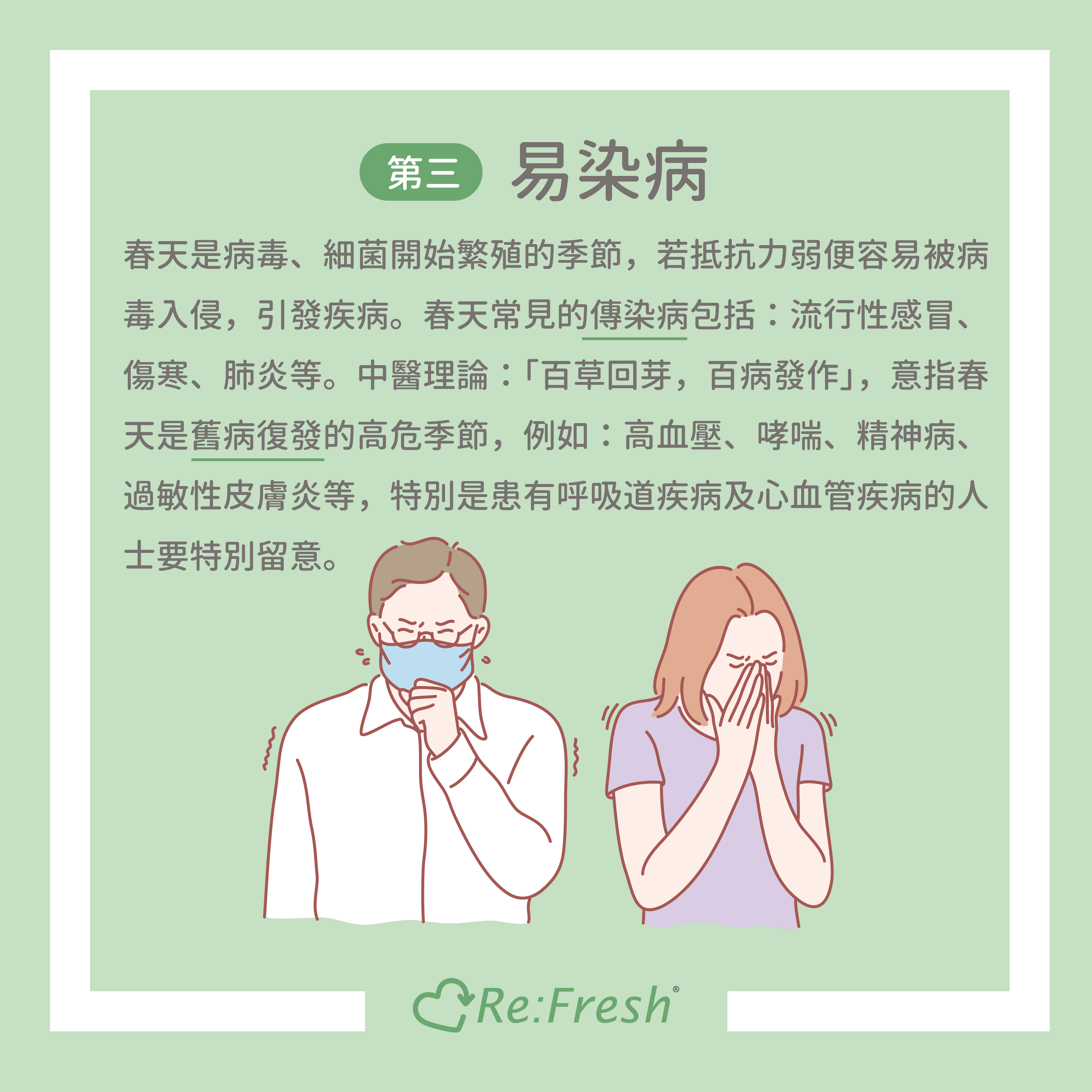 春天是病毒、細菌開始繁殖的季節,若抵抗力弱便容易被病毒入侵,引發疾病。春天常見的傳染病包括:流行性感冒、傷寒、肺炎等。中醫理論:「百草回芽,百病發作」,意指春天是舊病復發的高危季節,例如:高血壓、哮喘、精神病、過敏性皮膚炎等,特別是患有呼吸道疾病及心血管疾病的人士要特別留意。