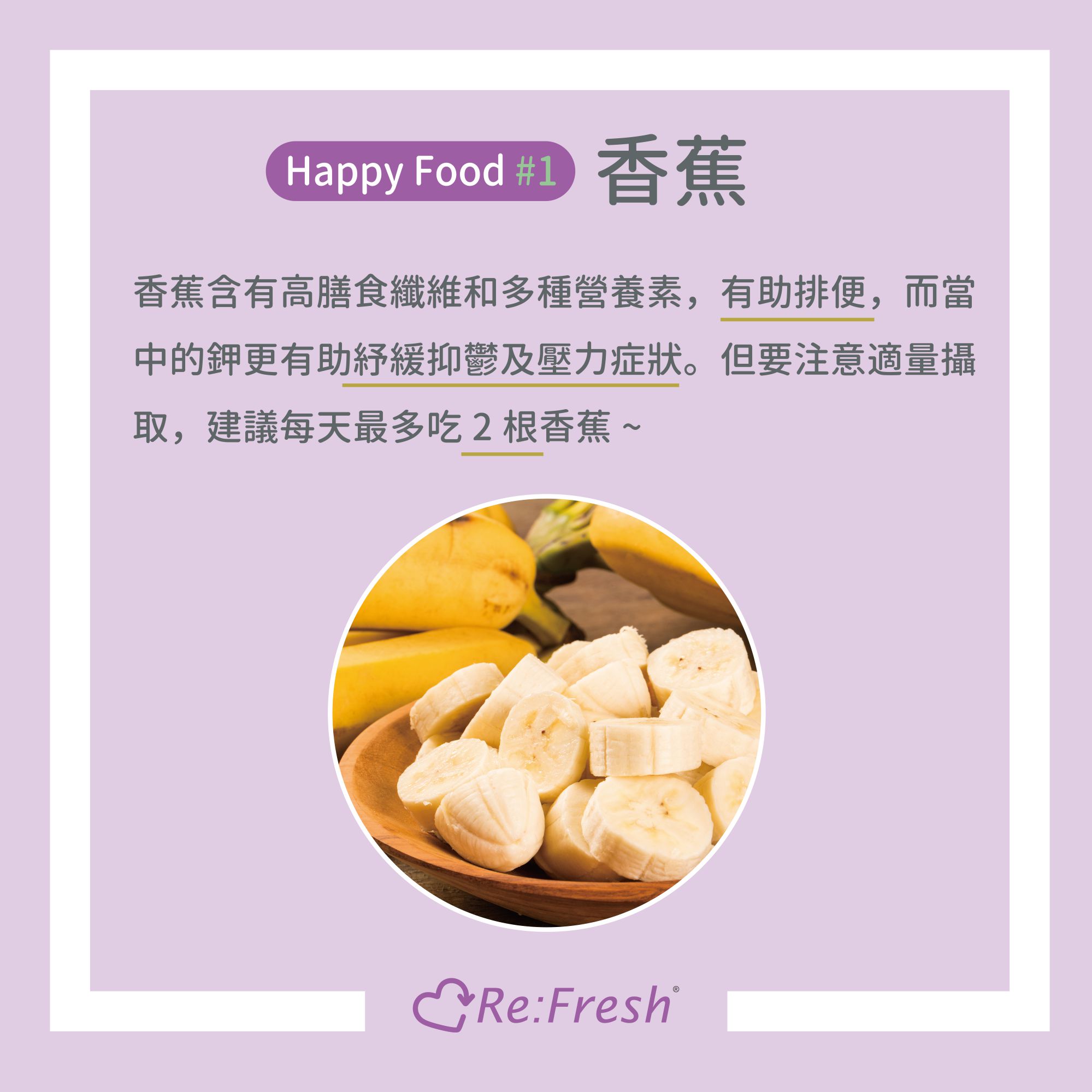 香蕉含有高膳食纖維和多種營養素,有助排便,而當中的鉀更有助紓緩抑鬱及壓力症狀,但要注意適量攝取,建議每天最多吃2根香蕉。