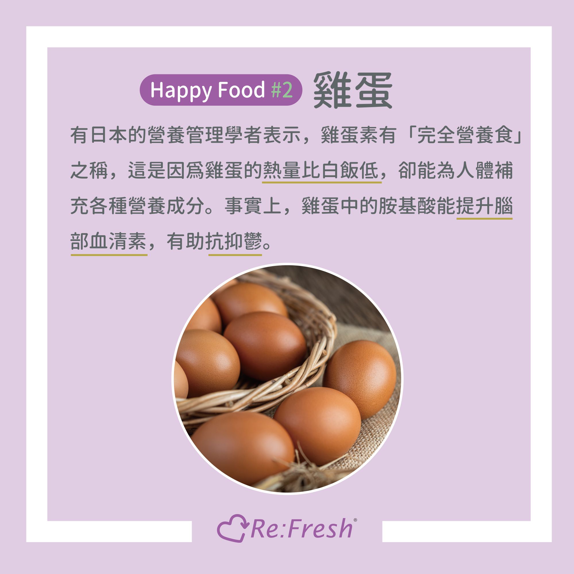 有日本的營養管理學者表示,雞蛋素有「完全營養食」之稱,這是因爲雞蛋的熱量比白飯低,卻能為人體補充各種營養成分。事實上,雞蛋中的胺基酸能提升腦部血清素,有助抗抑鬱。
