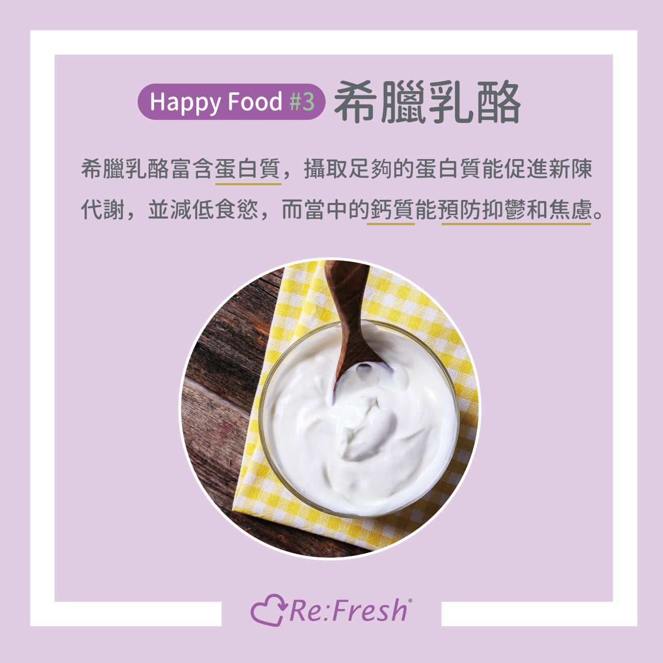 希臘乳酪富含蛋白質,攝取足夠的蛋白質能促進新陳代謝,並減低食慾,而當中的鈣質能預防抑鬱和焦慮。