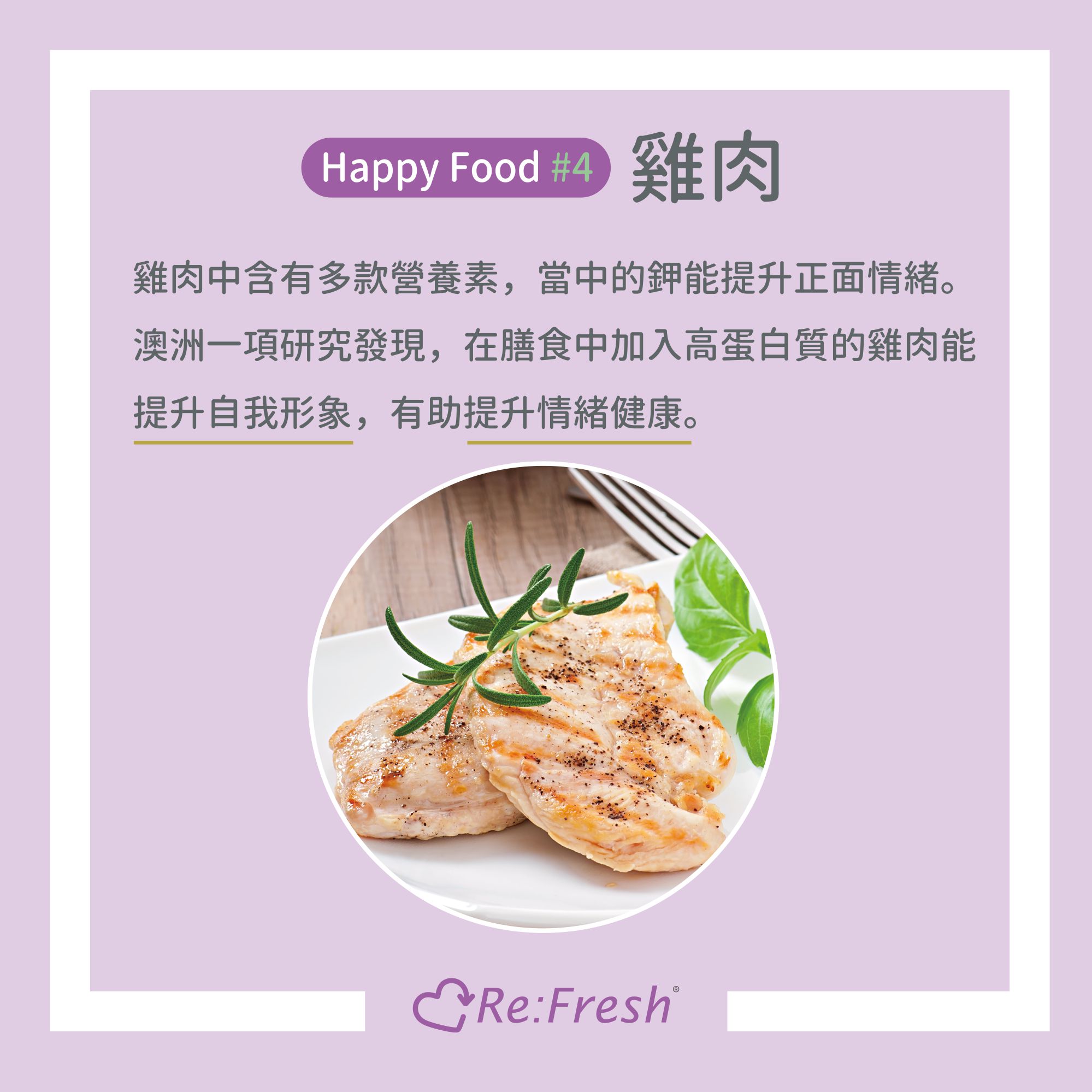 雞肉中含有多款營養素,當中的鉀能提升正面情緒。澳洲一項研究發現,在膳食中加入高蛋白質的雞肉能提升自我形象,有助提升情緒健康。