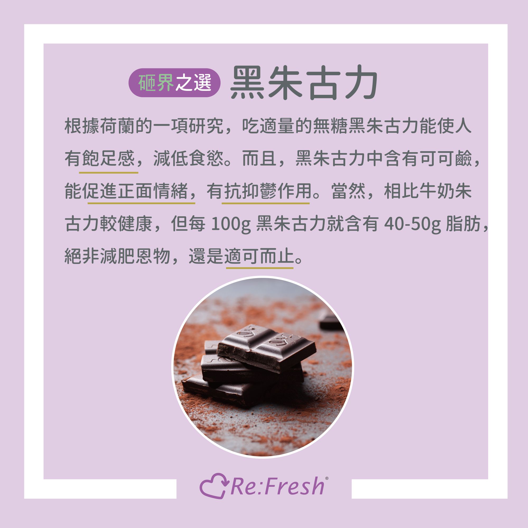 根據荷蘭的一項研究,吃適量的無糖黑朱古力能使人有飽足感,減低食慾。而且,黑朱古力中含有可可鹼,能促進正面情緒,有抗抑鬱作用。當然,相比牛奶朱古力較健康,但每100g黑朱古力就含有40-50g脂肪,絕非減肥恩物,還是適可而止。