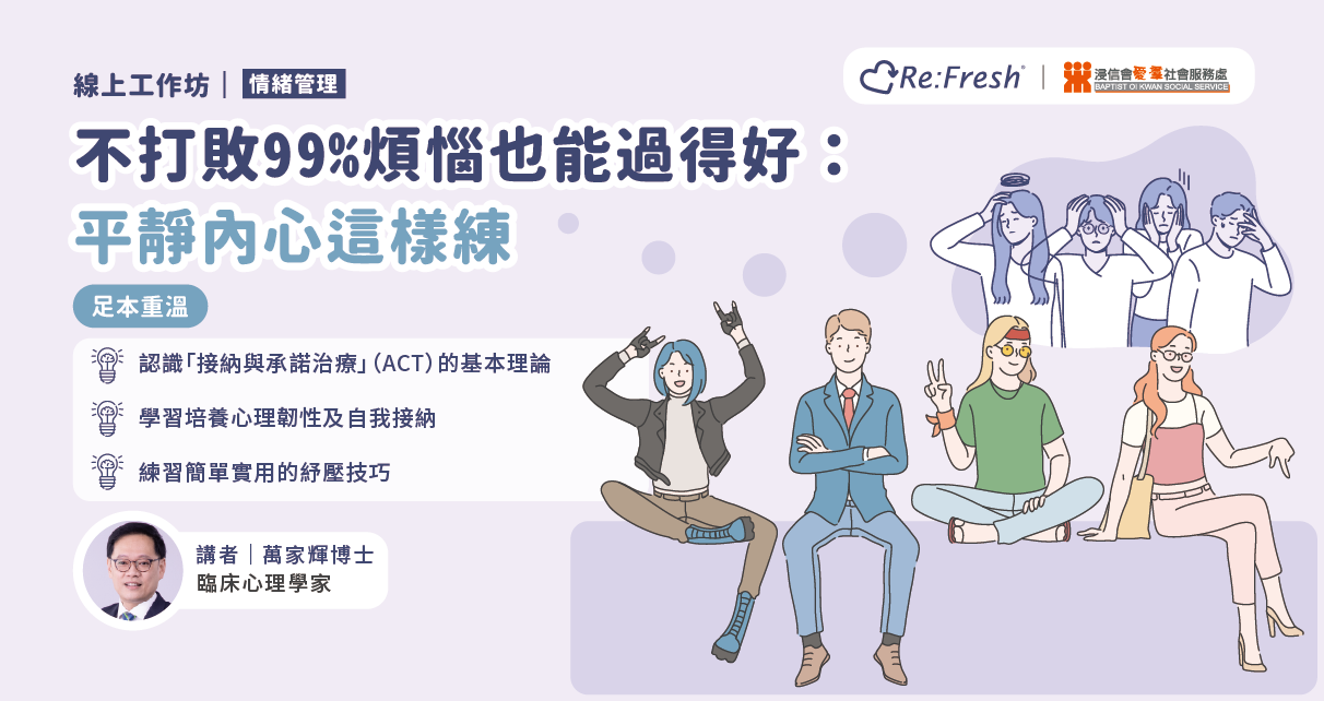 本活動將帶你探索「接納與承諾治療」(ACT)的精髓,透過科學實證的練習與技巧,學習培養心理韌性,深化自我覺察與接納,助你從容應對所有煩惱與挑戰,優雅駕馭壓力與情緒,讓疲憊的身心找回平衡與力量。